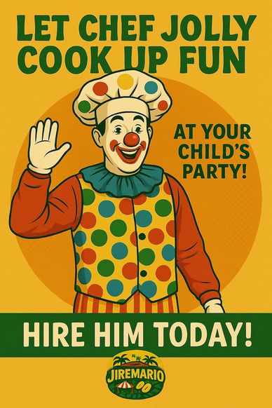 He’s not a real chef — but he sure knows how to bring the fun! Chef Jolly helps serve food, snacks, and treats for the kids while keeping the party atmosphere light, joyful, and full of laughter. With his bright personality and playful spirit, Chef Jolly makes sure every child feels special while enjoying their goodies.