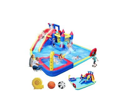 Features: dual slides, splash pool, water gun, basketball hoop, climbing wall, soccer game, and dual pools—perfect for backyard fun.