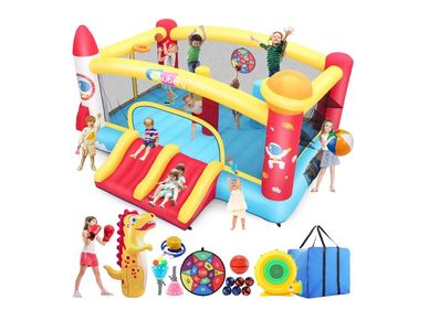 Launch your little astronauts into fun with this 13ft x 11ft x 7ft inflatable bounce house, featuring a spacious jumping area, dual slides, basketball hoops, and obstacle poles—perfect for ages 3–12.